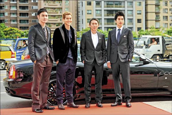 昨天的「四大型男見面會」,豆導「、小天」阮經天、趙又廷和彭于晏帥氣開著跑車入場,在台北101大樓前LOVE的裝置藝術前合影。3型男們都是目前市場上炙手可熱的演員,這場見面會上也不忘宣傳自己的作品,彭于晏一開口說:「大家好,我是翻滾的阿信。」趙又廷也現學說:「我是痞子英雄。」小天只好接話:「血滴子。」現場成了台灣電影的打片活動。