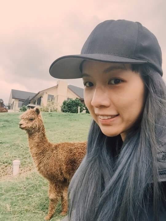 查查與可愛的草泥馬玩自拍。(滾石提供)2人因為背太多東西,一度趕不上回程列車,只見紐西蘭的原始森林,美景就像是世外桃源,查查說:「眼前成群牛和羊像山邊的樹一樣多,在登山步道的終點還看到農家有養草泥馬,台灣人養的寵物是貓狗,紐西蘭則是把萌萌的草泥馬都當寵物養,真是太可愛了。」