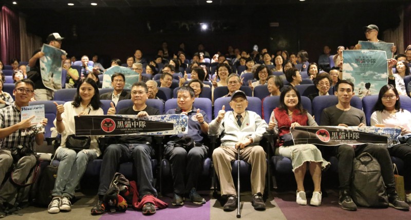 紀錄片《疾風魅影-黑貓中隊》昨映前大合照。(寬和影像提供)〔記者許世穎/台北報導〕紀錄片《疾風魅影-黑貓中隊》正在全台上映,遠從美國親自返台的教官張立義及從福州特地來台的陳懷生烈士義子陳靖,昨在導演楊佈新陪伴下一起進戲院觀賞電影。兩人多年前就曾見過面,這次在台灣重逢,張立義表示:「我第一次看,我也跟觀眾一樣好奇這部片會如何呈現。」陳靖則說:「我們不應該忘記歷史,希望大家能見到導演的努力。」