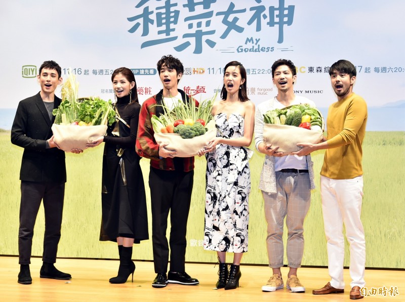《種菜女神》首映發布會;右起劉子千、鄒承恩、陳庭妮、劉以豪、李千娜、徐鈞浩。(記者陳奕全攝)