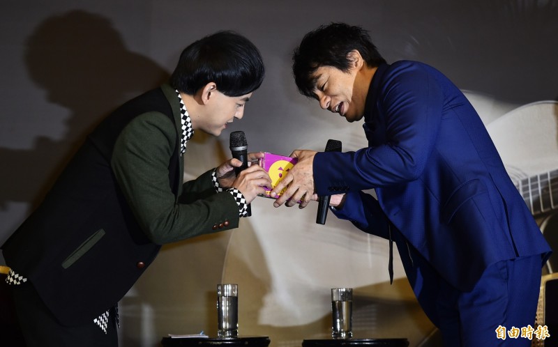 楊宗緯(右)為見偶像飛鳥涼(左),特地現身記者會。(記者陳奕全攝)飛鳥涼暌違10年訪台,他表示:「我在日本其實不太常上電視,在日本雖然也會看紅白,但我從來沒上過日本紅白,這次上台灣紅白我也覺得很不可思議。」主持人黃子佼也打趣說:「歡迎日本NHK高價收購版權!」