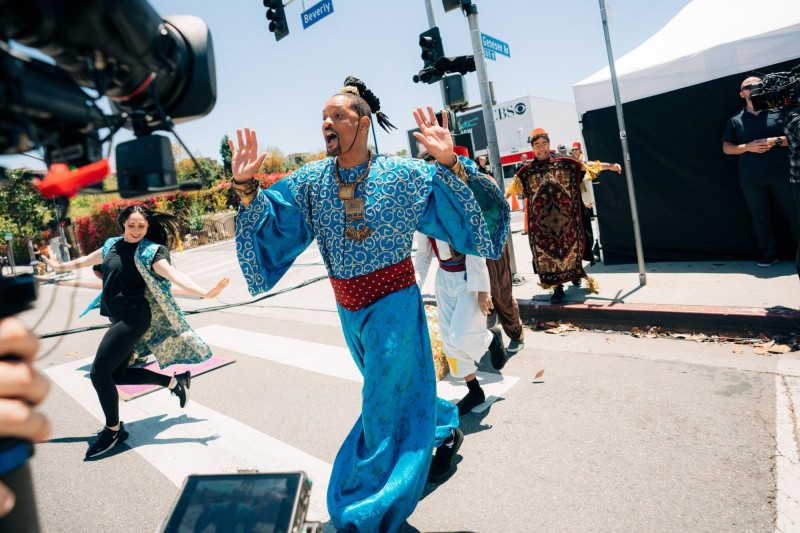 威爾史密斯(右2)在街頭上演《阿拉丁》馬路歌舞秀。(翻攝自推特)