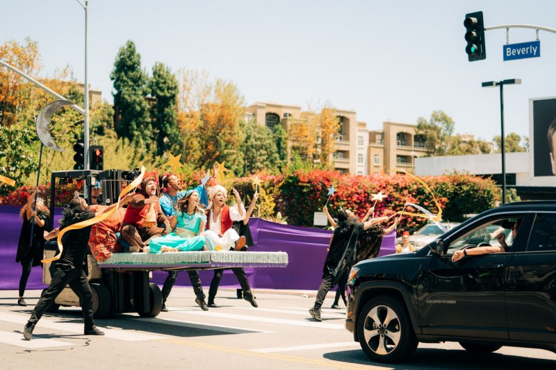 《阿拉丁》主要演員乘坐堆高機改裝的魔毯現身街頭,趁著紅燈大跳歌舞。(翻攝自推特)