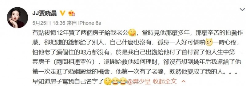 賈曉晨昨日又在微博PO文,透露與老公當年買房內幕:「有點後悔12年買了兩個房子給我老公,當時見他那麼多年,那麼辛苦的拍動作戲,卻把賺的錢都給了別人,自己什麼也沒有,孤身一人好可憐喲。」因心疼老公,賈曉晨決定自己出錢幫對方付好頭期款,還買了樊少皇人生中的第一間房子,並教他理財,「卻沒有想到幾年後我還給了他第一次走進了婚姻殿堂的機會,他第一次有了老婆,既然他變成了我的人…早知道房子寫我自己名字了。」