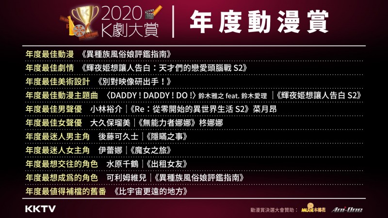 2020 KKTV 第二屆「K劇大賞-年度動漫賞」完整得獎名單