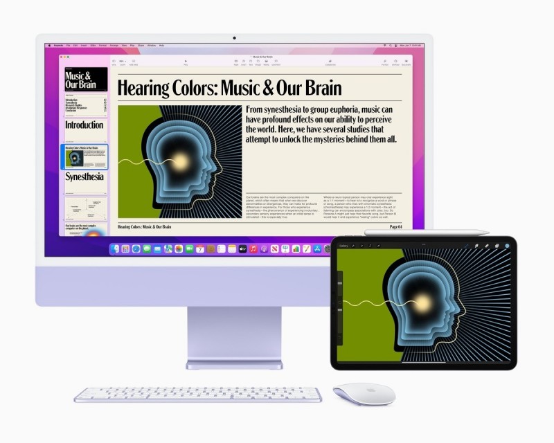 macOS Monterey強調更有效率地跨裝置工作,像是利用「通用控制」,在Mac和iPad之間切換時,可使用同一組滑鼠和鍵盤操作,在裝置之間來去自如,且無須進行任何設定;在iPad上用Apple Pencil繪製檔案後,直接拖放至Mac的Keynote簡報裡。