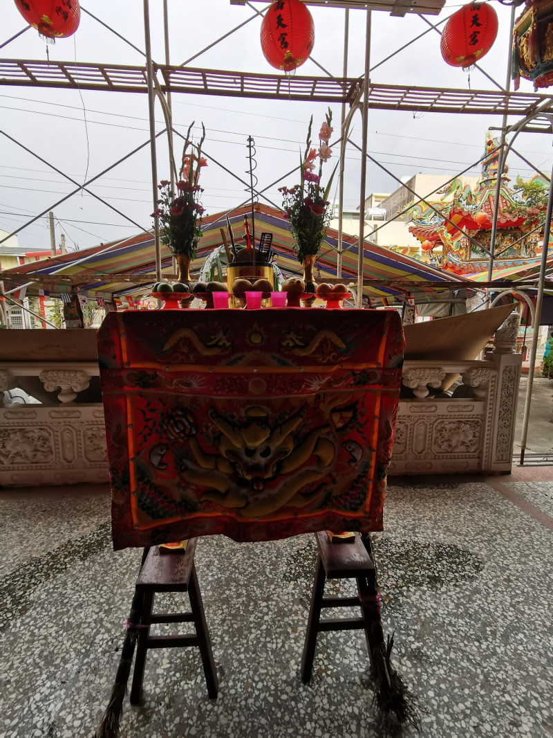 神位用紅綢墨書而成,前面為香爐,兩邊為燭台,爐前放紮著紅紙的麵線塔,或紮紅紙麵線三束也可,排列五果,從柑、橘、鳳梨、蘋果、李子、香蕉等任取五樣、六齋,從金針、桂圓、菜心、香菇、綠豆、海帶、木耳、菀豆等任取六樣,前設清茶三杯。在頂桌底面另置一桌,謂之「下桌」,為供奉玉皇大帝從神所設,除了雞、鴨、魚、豬肉或豬肚、豬肝這五牲外,還有糕仔、米棗、生仁、紅龜稞等。