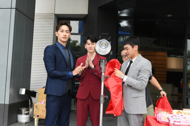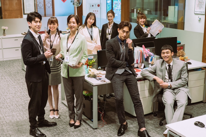 毛祁生(前排右二)、蕭鴻(前排右)、孫沁岳(左)主演《絕對佔領》,講述大老闆與純情小秘書的職場攻防愛情。(三立提供)