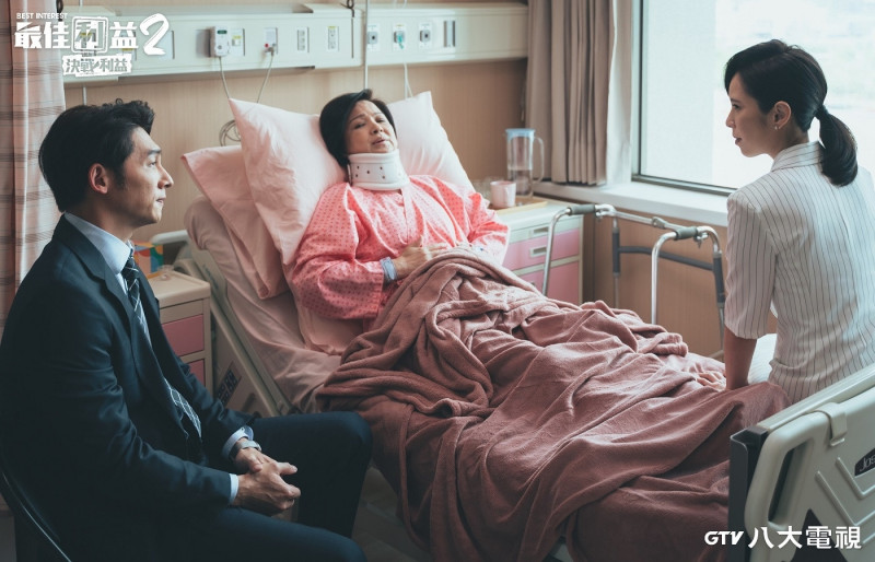 楊貴媚(中)在《最佳利益2-決戰利益》飾演法學教授,因交通意外送進醫院,曾是她指導的學生天心(右)、温昇豪趕至醫院探視。(八大電視提供)