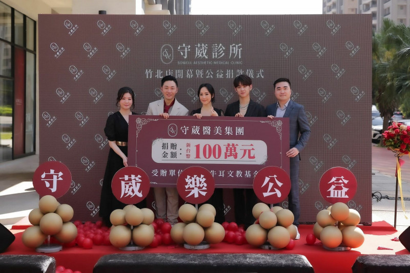 洪暐哲(右二起)、關穎擔任醫美診所開幕剪綵嘉賓。(守葳醫美集團提供)