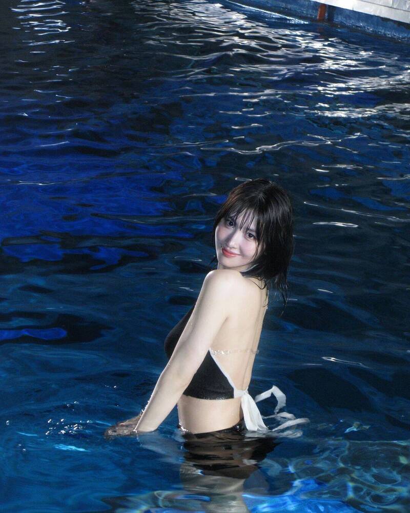 Momo貼出多張在拍攝形象照的側拍照,可見她穿上黑色泳裝,大裸雪白美背;另一張照片更是他在水中拍完後起身的樣子,讓眾多網友看了目不轉睛。