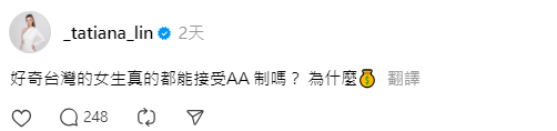 佳娜在Threads發問,「台灣的女生真的都能接受AA制嗎?為什麼?」。(翻攝自Threads)