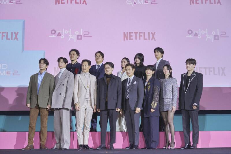 《魷魚遊戲》第二季9日在首爾盛大舉辦記者會,李陣郁(前排左起)、朴成焄、李政宰、導演黃東赫、李炳憲、任時完、朴珪瑛、姜河那,梁東根(後排左起)、李書煥、康愛心、曹柔理、魏嘏雋盛裝出席。(Netflix提供)