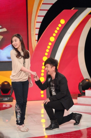 黃舒駿以及他的嫩妻Sophia昨同上節目,重現當時求婚景貌。(三立提供)〔本報訊〕甫與嫩妻張菁芳(Sophia)新婚的藝人黃舒駿,夫妻兩人昨天首度上節目。兩人爆料交往三個多月以來都還沒「全壘打」,直到婚宴後才要大解放,讓眾人不禁擔心「都沒用過,會不會太危險?」黃舒駿則打包票,對自己有信心。Sophia也提到,生小孩的事順其自然就好。