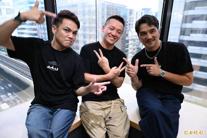 馬志翔(右)在台片《獵人兄弟》飾演弟弟,中為導演蘇弘恩,左為徐詣帆。(記者胡舜翔攝)