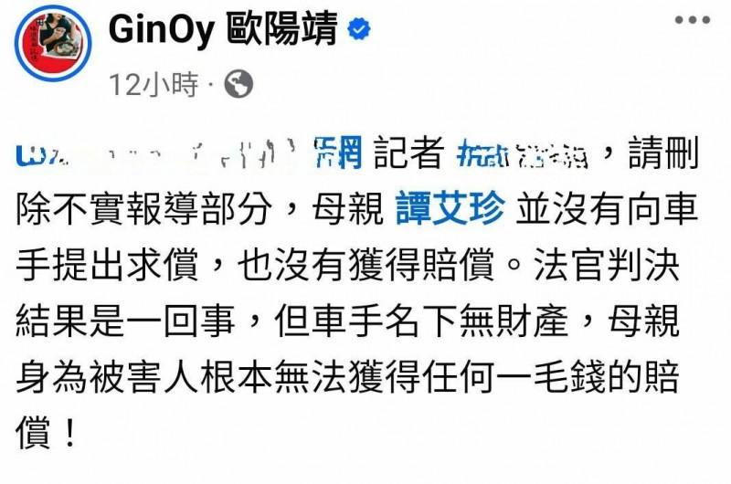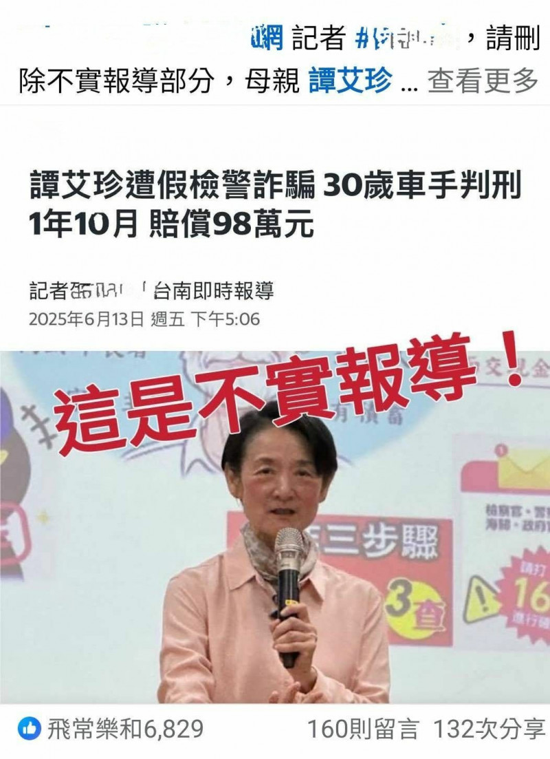 譚艾珍遭詐騙交付98萬元,後續媒體報導她委任退休資深檢察官羅瑞昌打民事官司求償,最終判李姓車手應賠償98萬元,歐陽靖看到報導後,在臉書譴責是「不實報導」。(翻攝自臉書)