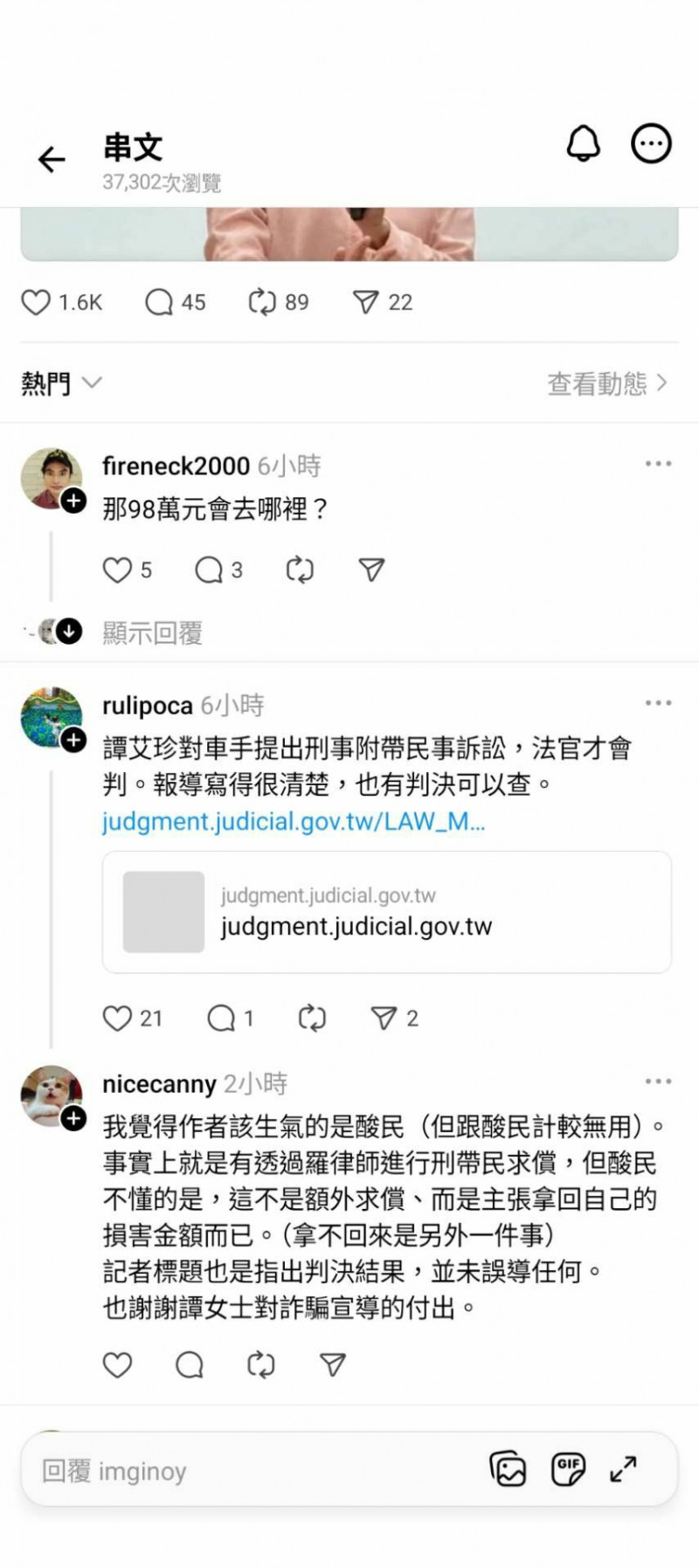 歐陽靖的文章提到,車手李男名下無財產,譚並未獲得任何實際賠償,母親在受騙後未選擇沉默,而是積極投入防詐倡議,只盼能減少類似悲劇發生,然而媒體僅憑判決書撰稿,未進一步查證,導致網路上出現「名人才請得起律師」、「藝人才能討回詐款」等評論,造成對被害人的二度傷害,並揚言對記者提告。