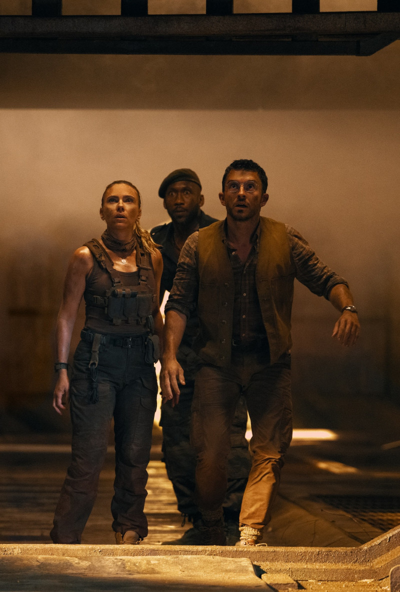 思嘉喬安森(左起)、馬赫夏拉阿里、喬納森貝利在《侏羅紀世界:重生》中執行秘密任務。(UIP提供)