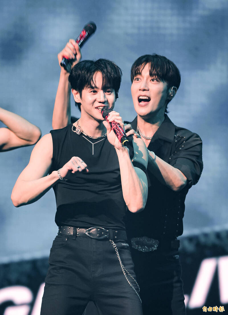 梁耀燮(前)、尹斗俊搞笑示範「Don’t push」的動作,要粉絲不要推擠。(記者王文麟攝)