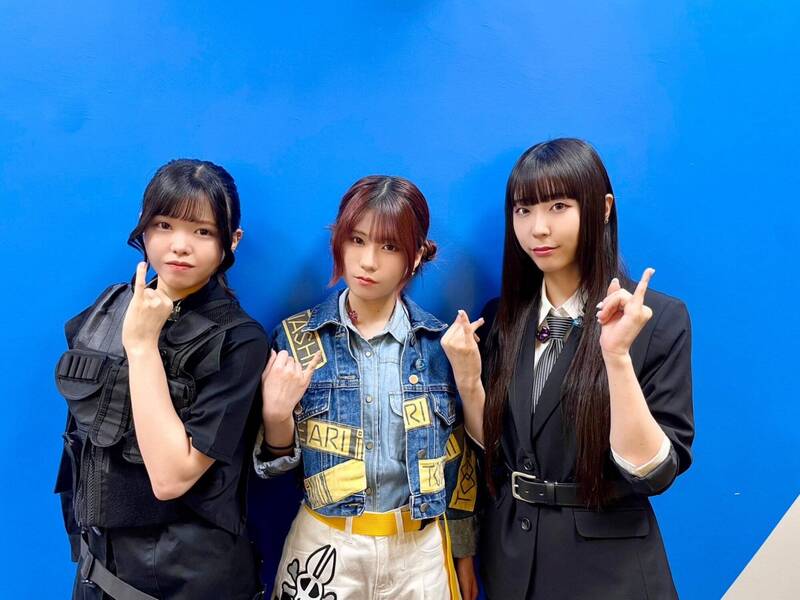 日本話題動畫《少女樂團 吶喊吧》衍生出的樂團TOGENASHI TOGEARI的貝斯手朱李(左起)、理名及夕莉開演前接受訪問,比出招牌的小拇指動作。(環球音樂提供)