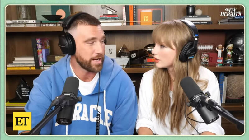 泰勒絲(右)與男友凱爾斯(左)一同錄製網路廣播節目,甜蜜相視。(翻攝自New Heights官方YouTube頻道)