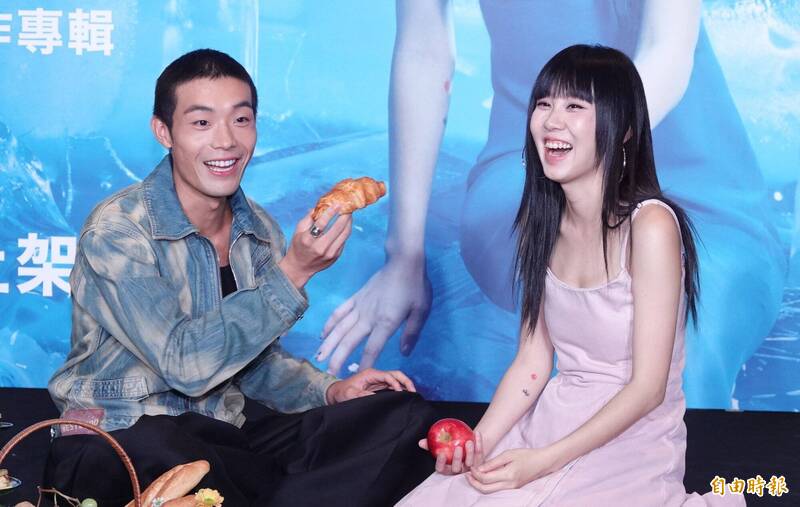 白安(右)和牧森在MV中有不少親密互動,她大讚牧森很帥。(記者潘少棠攝)