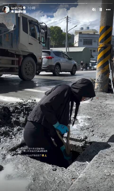 籃籃一早自台北趕往花蓮,抵達後綁著雙馬尾、頂著素顏,手持鏟子直接跳進水溝清除淤泥,過程中一度只剩頭部露出地面,被形容宛如「忍者龜」,展現零偶包行動力。她在社群上感性寫下:「4小時300公里的距離,繼續努力!」