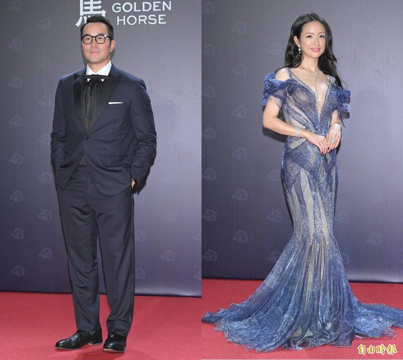 張孝全(左)秀出兒子送給他的幸運物「戰鬥陀螺」;林依晨以一襲紫色魚尾禮服登場。(新聞攝影組攝)