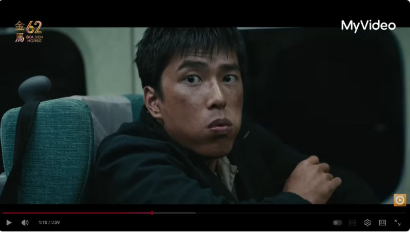 曾敬驊以在「大濛」中滿臉泥沙,外型黝黑的造型出現在金馬獎開場影片中。(圖片擷取自MyVideo金馬線上直播)