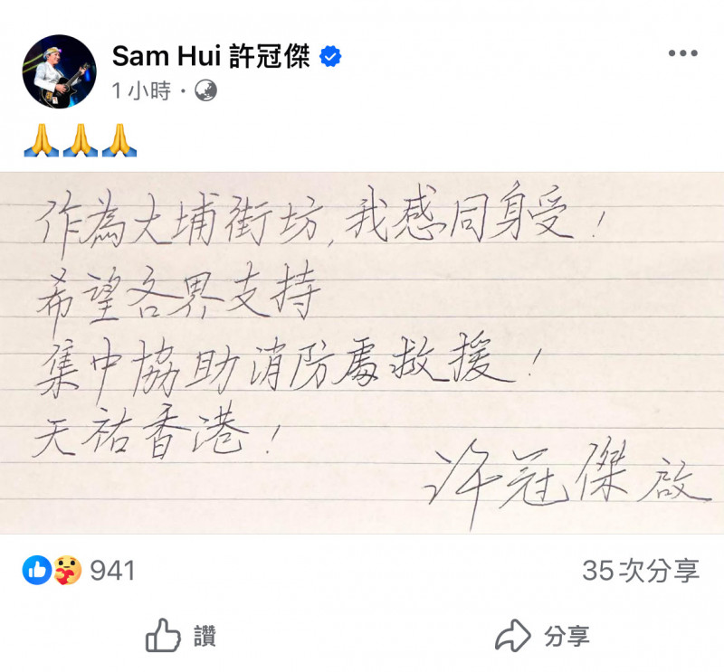 〔娛樂頻道/綜合報導〕香港新界大埔區住宅「宏福苑」昨天發生重大火災,多棟大樓陷入火海,造成多人死傷,香港娛樂圈許多活動都因此而取消,77歲「香港歌神」許冠傑的官方粉絲頁也曬出他的親筆短信,希望外界伸出援手。