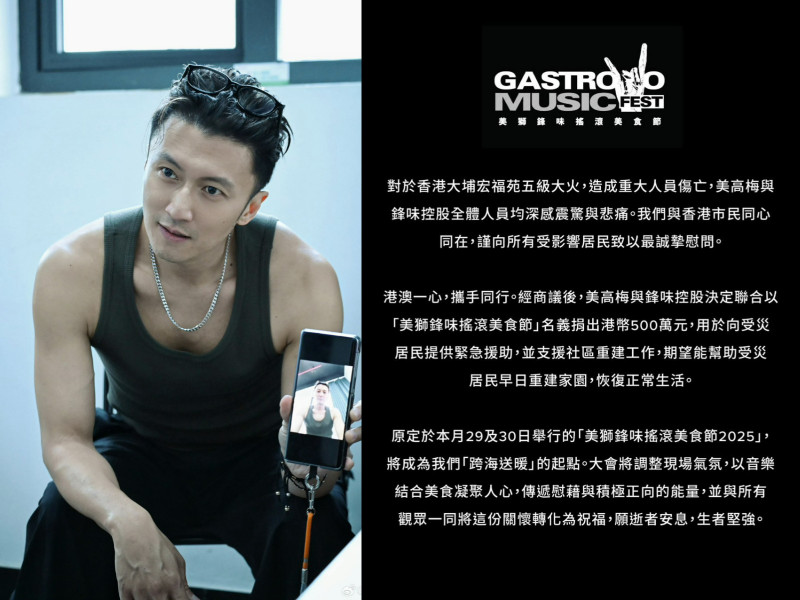 謝霆鋒在IG發出聲明,「美高梅與鋒味控股決定聯合以『美獅鋒味搖滾美食節』名義捐出港幣500萬元,用於向受災居民提供緊急援助,並支援社區重建工作,期望能幫助受災居民早日重建家園,恢復正常生活。」陳小春一家人則是捐100萬港幣到「保良局扶弱基金-支援宏福苑大夥居民專項戶口」。