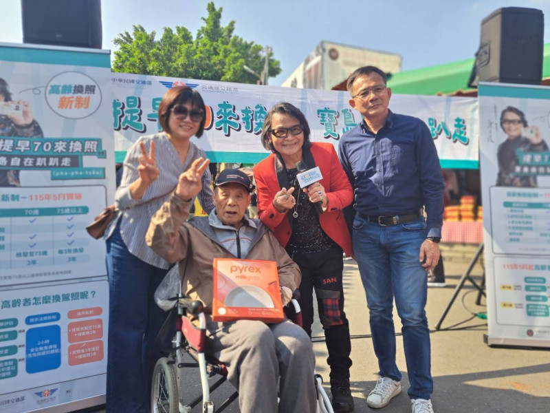 高齡換駕照代言人沈文程(右二),宣導明年五月將上路的新措施。(交通部提供)