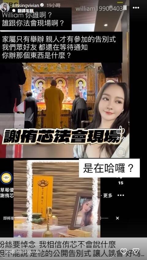 近日網路瘋傳一段疑為謝侑芯招魂法會影片,影片中,法師擲筊詢問:「妳來了嗎?」引發不少討論,對此,閨蜜謝薇安昨晚在IG限時動態發文打臉。
