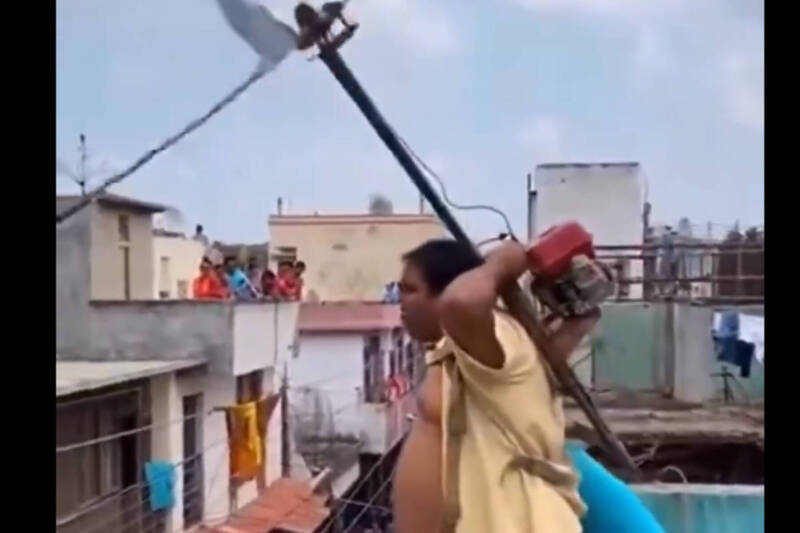 巴基斯坦男子身揹巨大竹蜻蜓挑戰飛行。(翻攝自X)