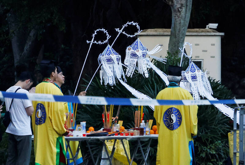 香港大埔宏福苑大火已造成至少151人罹難。道士1日在災難現場旁舉行路祭法會,超渡亡魂,祈求逝者安息。(路透社)