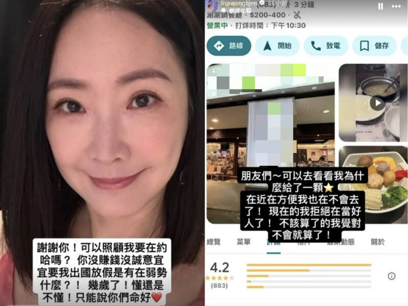 王俐人上個月在火鍋店用餐發生爭議,事後在Google評論區留下1星負評,意外引發軒然大波。(經馬賽克處理,翻攝自IG)