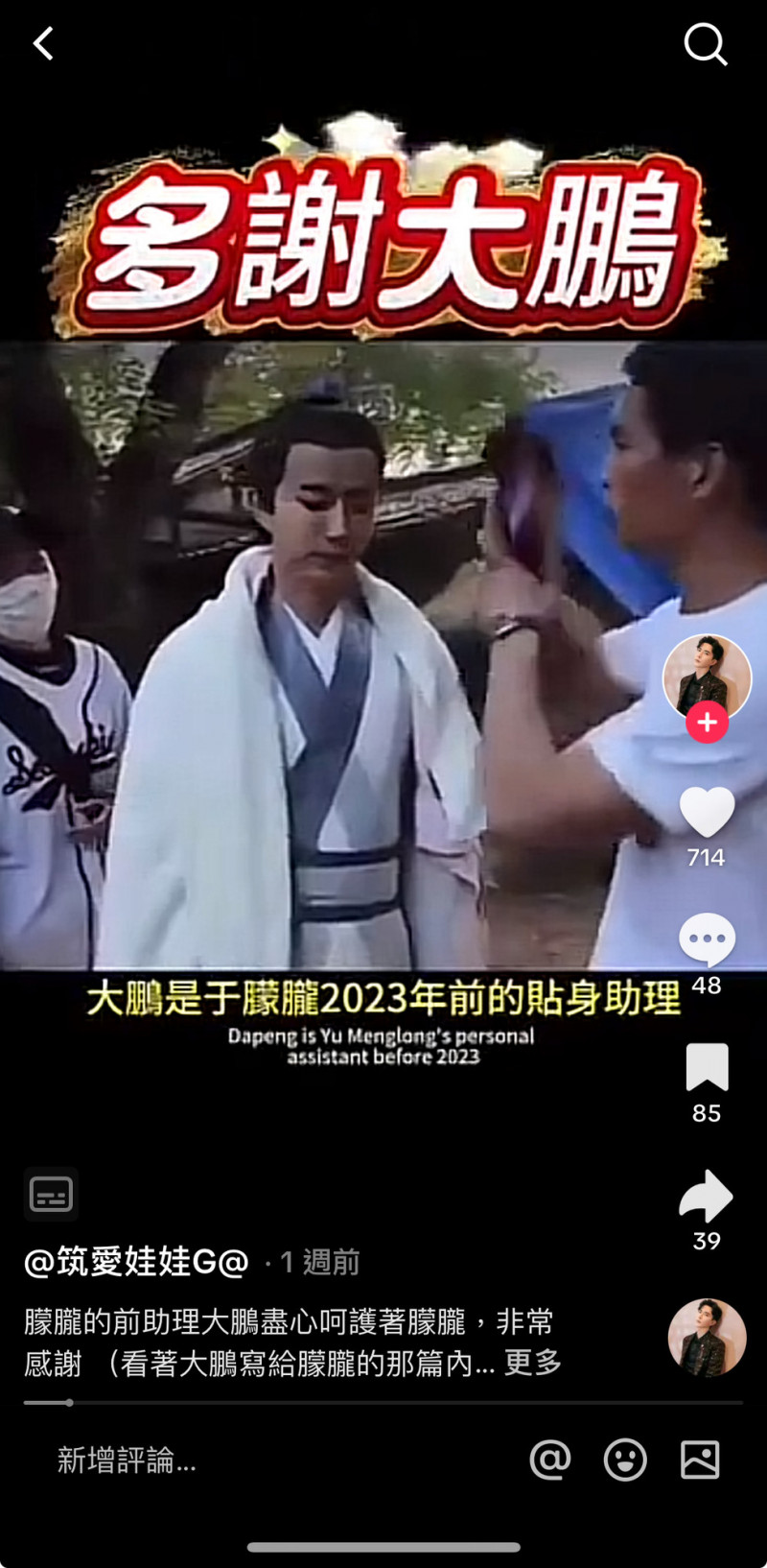 于朦朧粉絲整理過去影片,感謝貼身助理大鵬悉心照顧他。(翻攝自TikTok)