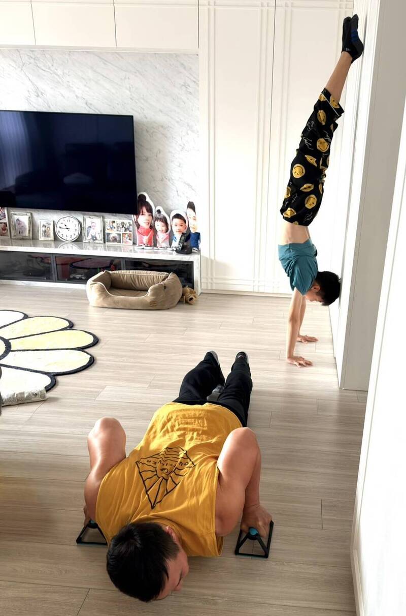 在嚴立婷曬出照片配文寫下:「從房間走出來看到這畫面,請問合理嗎?」照片中她老公在地上做俯臥撐,兒子則在一旁倒立,她說:「什麼運動場,果然有其父必有其子。」更笑稱:「不要逼我在旁邊做瑜珈喔!」