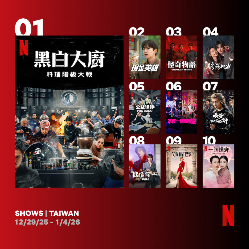 韓國原創實境節目《黑白大廚:料理階級大戰》第二季火力全開,不僅在台灣蟬聯第3週冠軍,還同步打進亞洲6國節目排行榜,堪稱年末最忙的「料理霸主」。而榜單前段班依舊被韓劇與原創內容包辦,《現金英雄》、《公益律師》、《偶像瘋子》輪番上陣,美劇《怪奇物語》第5季也強勢回歸,跨年檔期觀眾顯然偏好話題度與熟面孔兼具的作品。