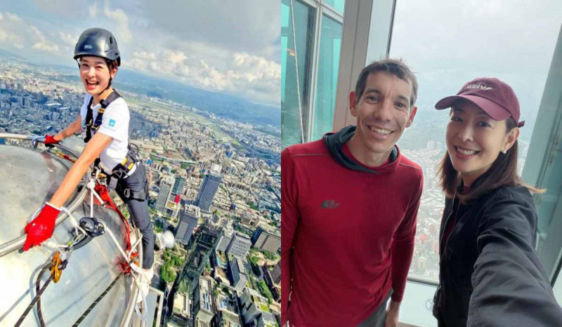 賈永婕與美國極限攀岩家艾力克斯。(右圖左)合照。(翻攝自臉書)