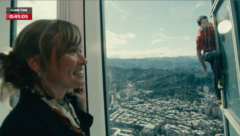 老婆桑妮在台北101的60樓為霍諾德打氣。(翻攝自Netflix)