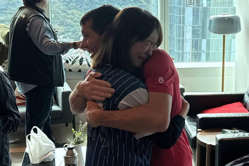 美國攀岩家霍諾德(右)挑戰徒手攀爬台北101與賈永婕激動擁抱。(翻攝自IG)
