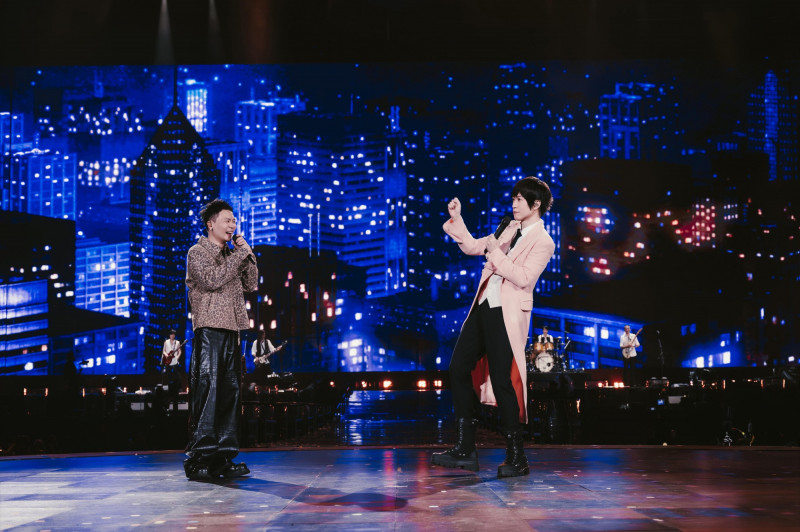 五月天阿信(右)和蕭秉治合唱,身上又穿起粉紅色外套。(相信音樂提供)