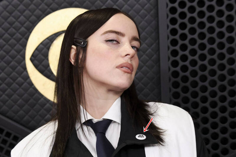 怪奇比莉參加葛萊美獎時在身上別著「ICE滾出去」的胸章。(路透)
