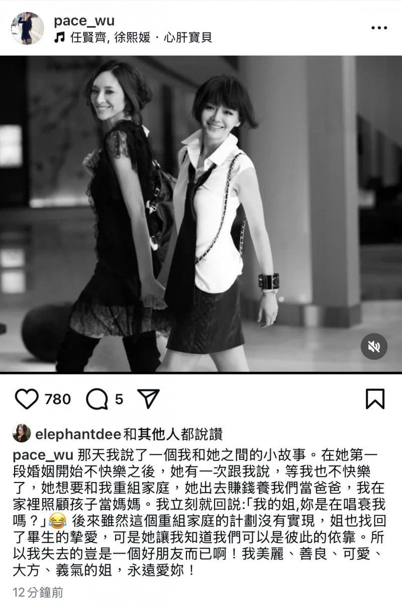 吳佩慈寫道那天說了關於自己和大S的小故事,「在她第一段婚姻開始不快樂之後,她有一次跟我說,等我也不快樂了,她想要和我重組家庭,她出去賺錢養我們當爸爸,我在家裡照顧孩子當媽媽。」當時吳佩慈立刻回她:「我的姐,妳是在唱衰我嗎?」