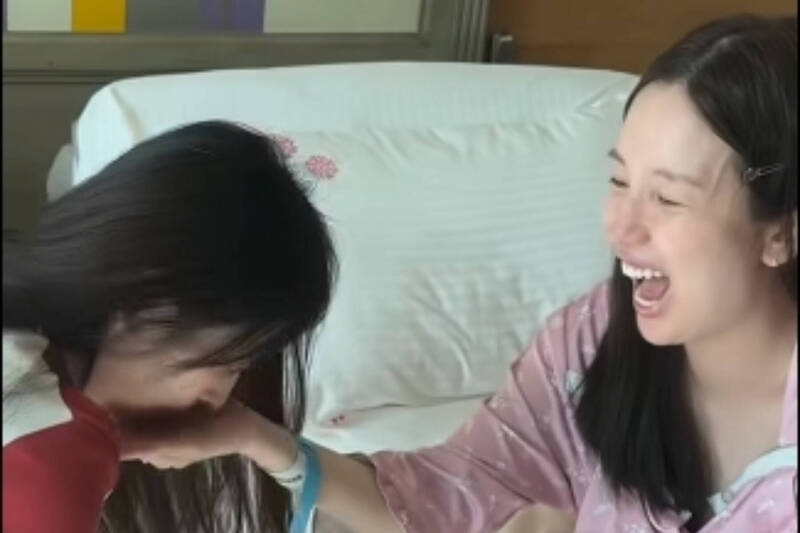 愛雅(右)產後第一次開奶,好友阿喜忍不住嘗一口。(翻攝自臉書)