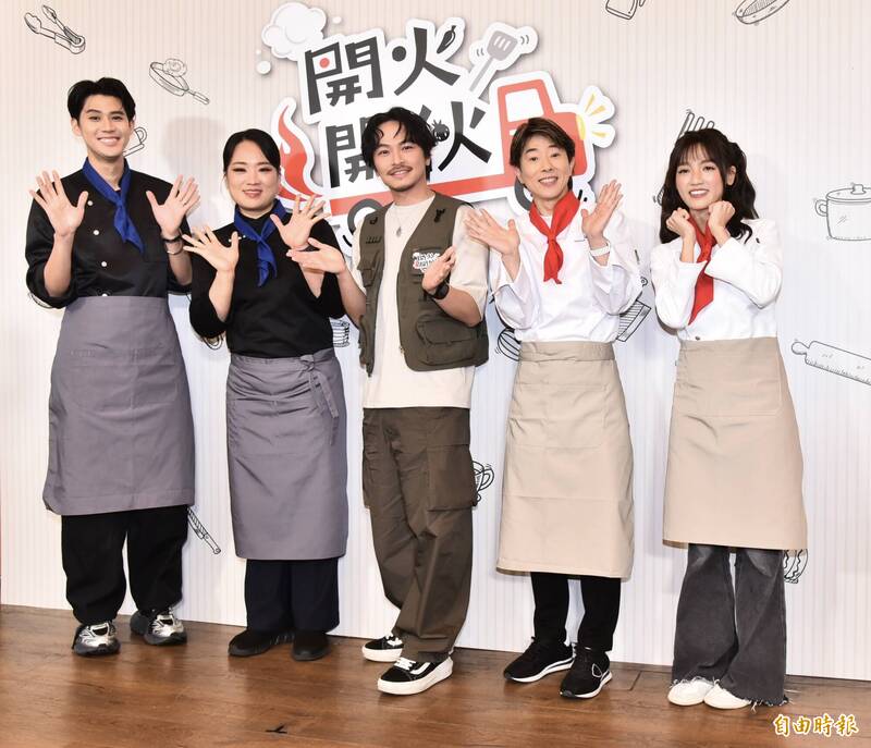 《開火開伙》媒體聯訪;李玉璽(左起)、鄭智善、楊銘威、川越達也、Dora謝雨芝。(記者陳奕全攝)