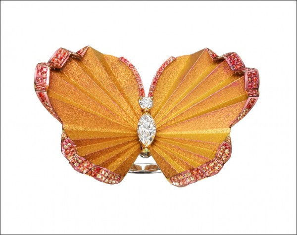 Chopard Red Carpet系列鈦金蝴蝶戒指,鑲嵌鑽石與黃橙色剛玉,630,000元。Chopard Red Carpet系列鈦金蝴蝶戒指,鑲嵌鑽石與黃橙色剛玉,630,000元。