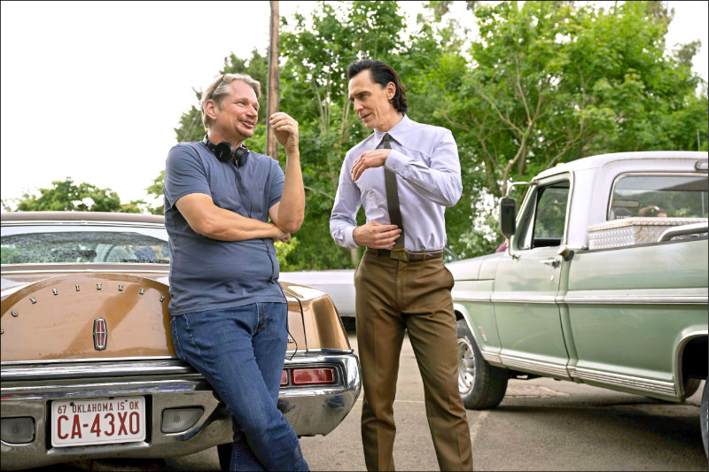導演丹德里伍(左)和湯姆希德斯頓合作影集《洛基》第2季,大讚他戲裡戲外都非常傑出。(Disney+提供)