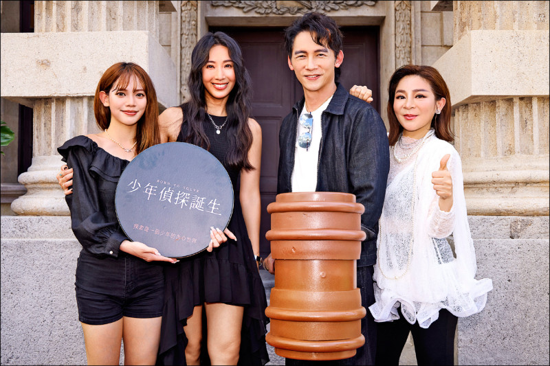 黃于庭(左起)、隋棠、温昇豪、王彩樺主持推理節目《少年偵探!誕生》,昨在台南合體為節目造勢。(灰人文化提供)